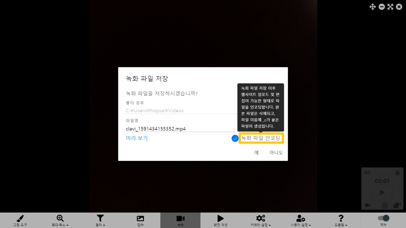 영상을 녹화할 때 저장된 파일은 확장자 mp4를 가지고 있지만, 코덱의 문제(범용적이지 않은 코덱을 사용했었습니다.)로 곰믹스나 무비메이커 등에서 해당 파일을 인식을 하지 못했었습니다. 이 문제를 해결하기 위하여 녹화 영상의 인코딩 기능을 추가했습니다. 영상 녹화 후 저장할 때 '녹화 파일 인코딩'이라는 체크 박스가 체크되어 있으면, 백그라운드에서 녹화된 파일이 자동으로 범용적인 코딩으로 인코딩됩니다. 인코딩 시간은 컴퓨터의 성능과 파일 크기에 따라 달라집니다. 백그라운드에서 진행되므로, 다른 작업을 계속 진행하시면서 인코딩할 수 있습니다.