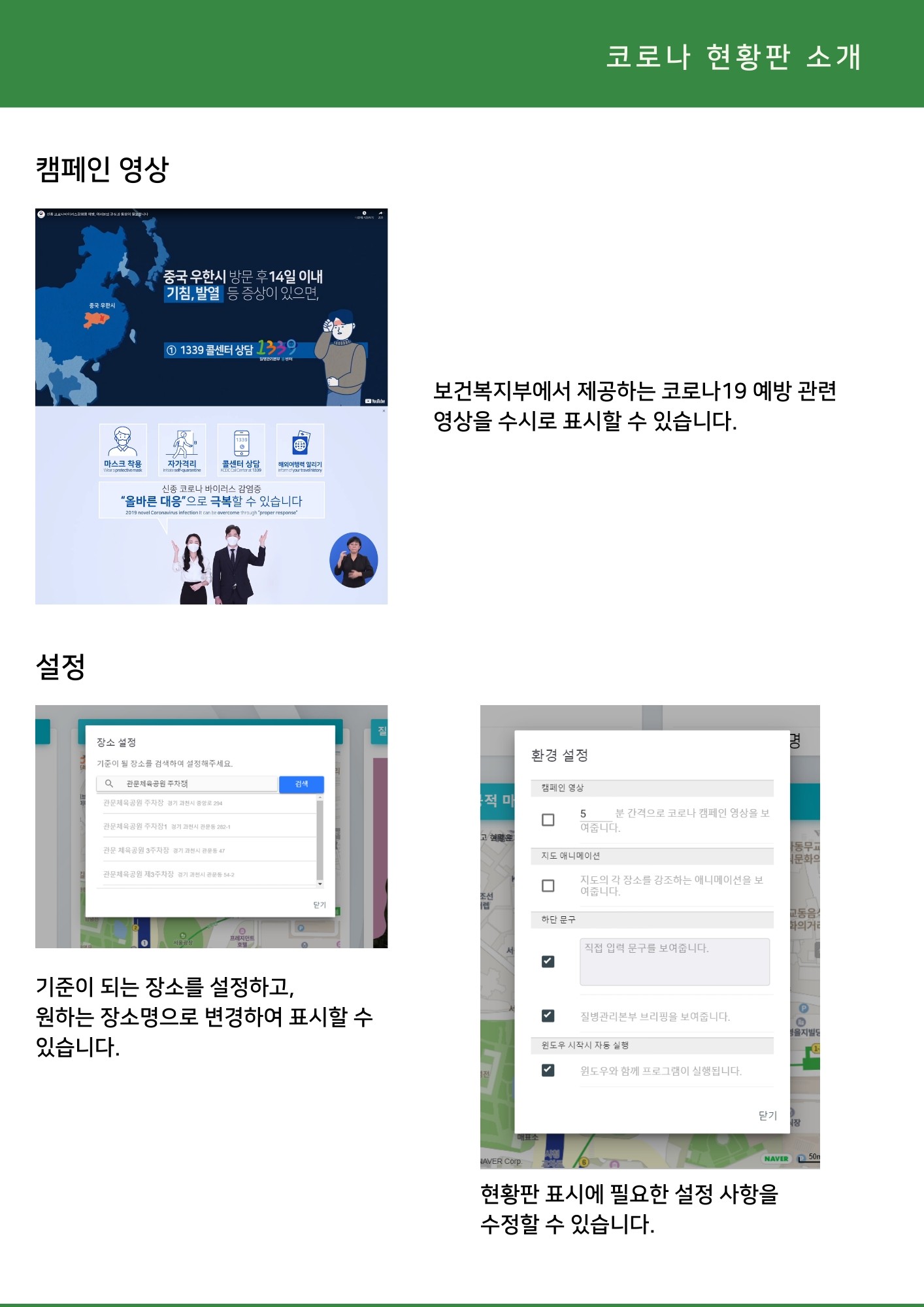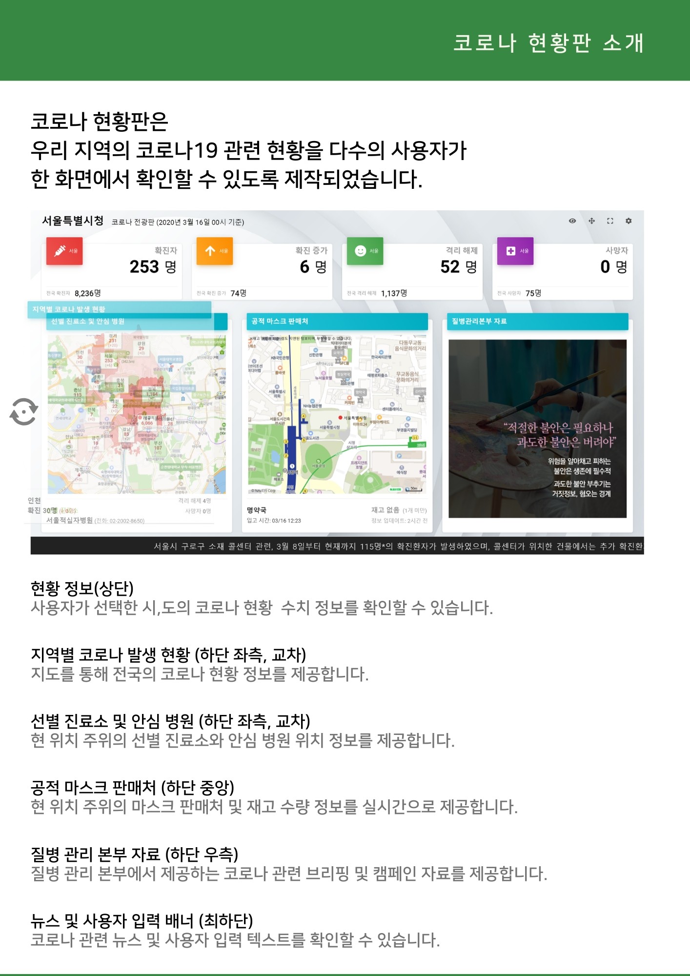 위와 같은 장소들에서 코로나 관련 정보 및 캠페인, 마스크 구매 정보들을 보여줄 수 있으면 좋을 것 같습니다.