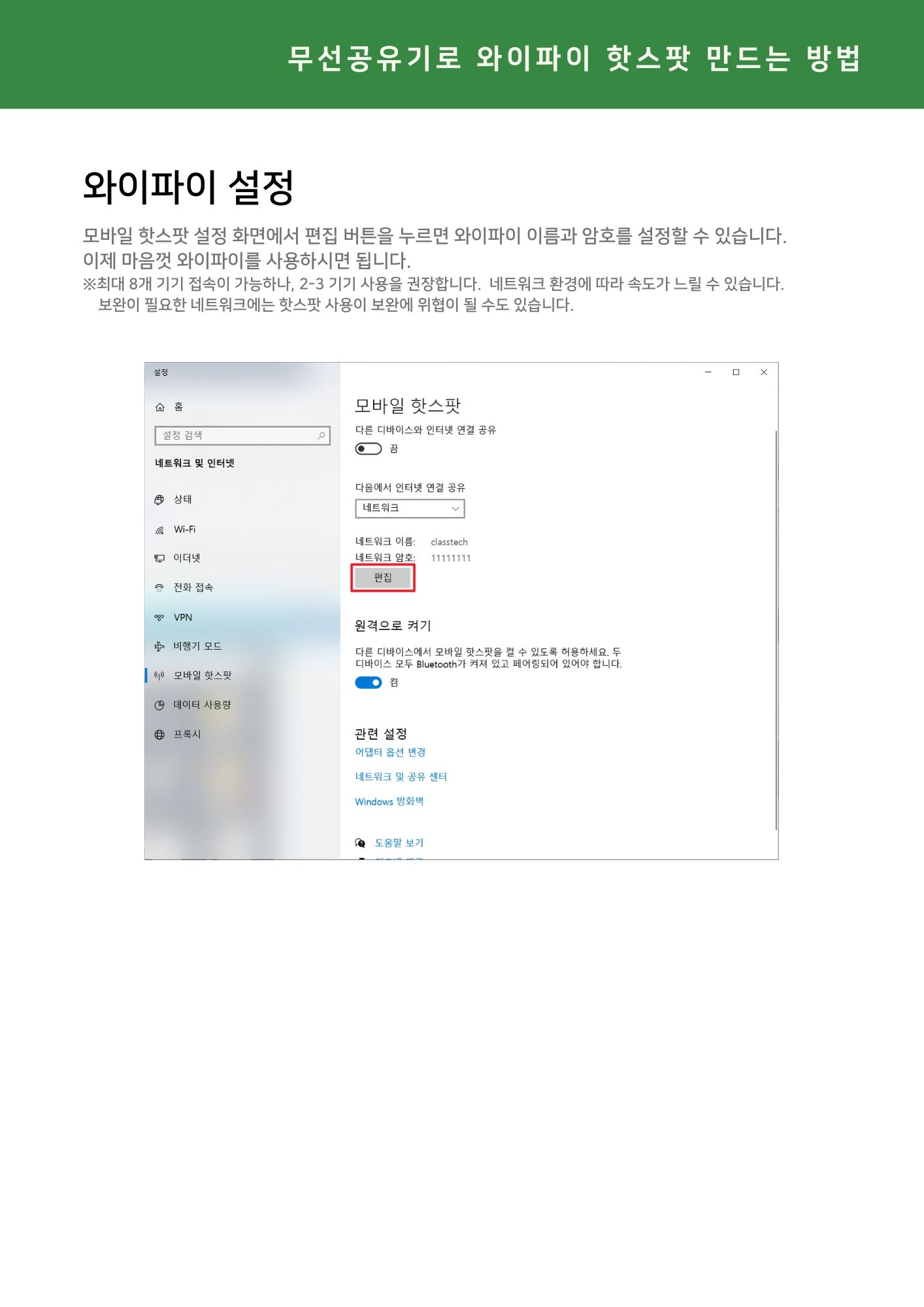 핫스팟을 키고 난 후의 일은 평소 와이파이 사용하듯 스마트폰에서 '모바일 핫스팟' 설정 과정에서 정한 wifi 이름과 비밀번호를 입력하는 것입니다.