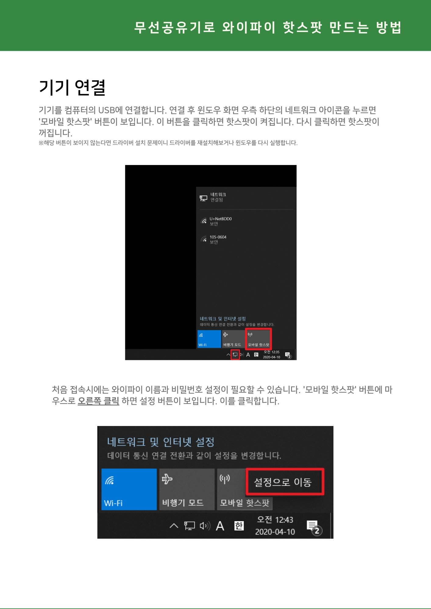 다운로드 받은 드라이버 파일 실행(설치) -> 모바일 핫스팟 버튼 누르기(처음 사용시 설정 필요)가 핫스팟 만들기의 끝입니다.