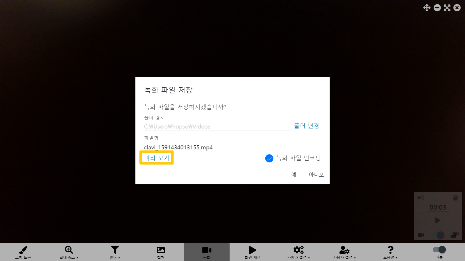 녹화 미리보기 기능은 1.3 버전대에서 이미 존재했던 기능이었습니다.