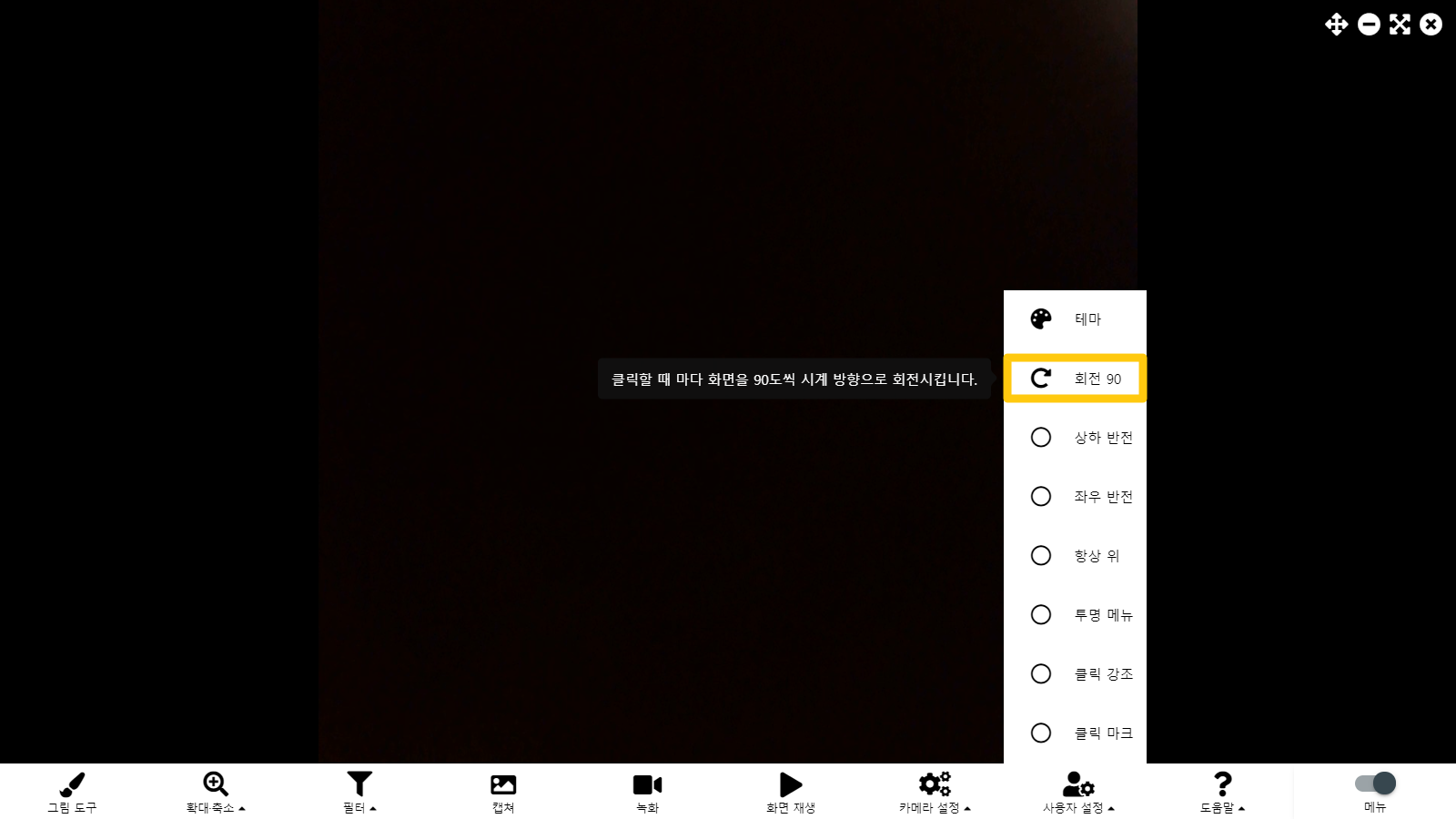 세로 화면이 필요한 경우가 있다는 요구가 있어 화면 회전 기능을 추가하였습니다. 회전 버튼을 클릭할 때마다 시계 방향으로 90도씩 화면이 회전하게 됩니다.