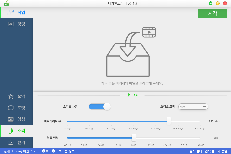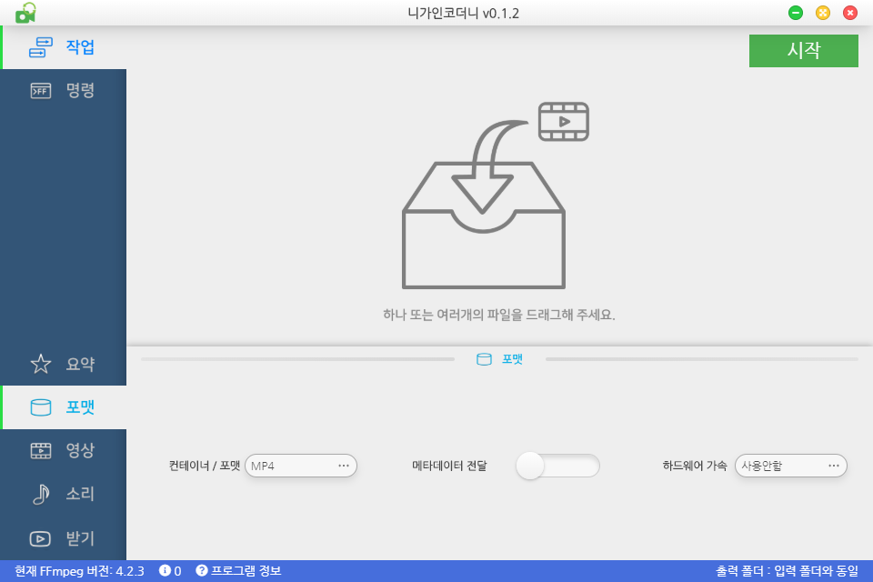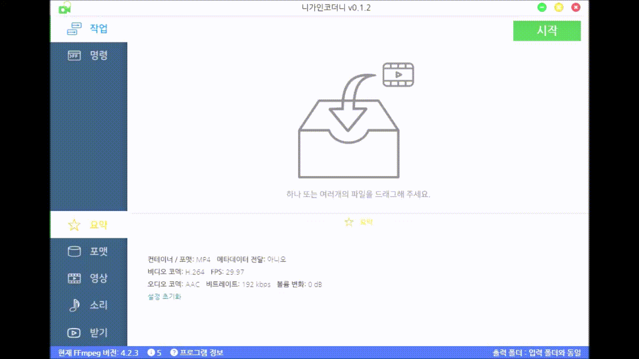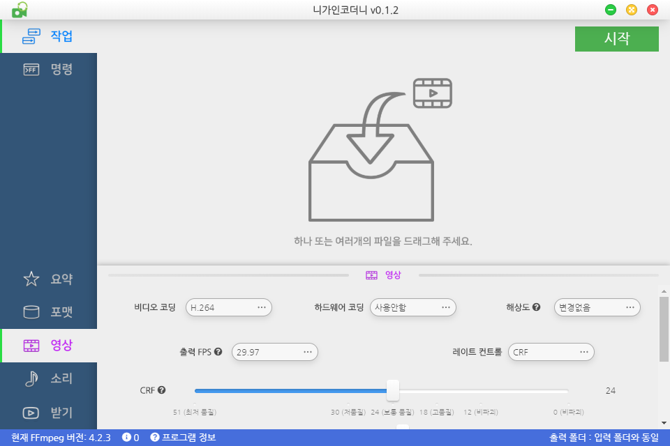 프로그램에다 영상 파일을 드래그 엔 드롭하고 시작 버튼만 누르면 바로 인코딩이 진행됩니다.