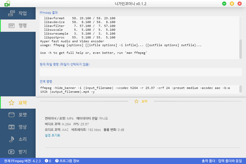 FFMpeg 관련 설정이나 인코딩 진행 현황을 보고 싶으시면 '명령' 탭을 이용하시면 됩니다.