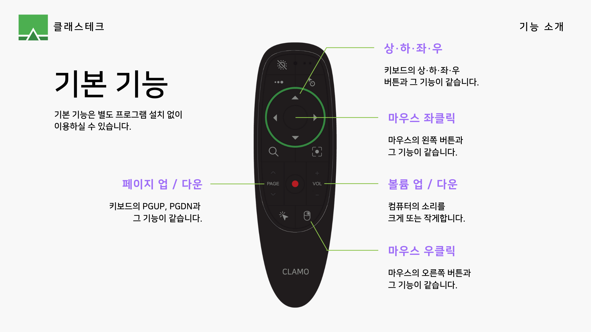 이와 같은 기존 프리젠터의 부족한 점을 보완하여 탄생한 것이 바로 클래스테크의 프리젠터 클래모입니다.