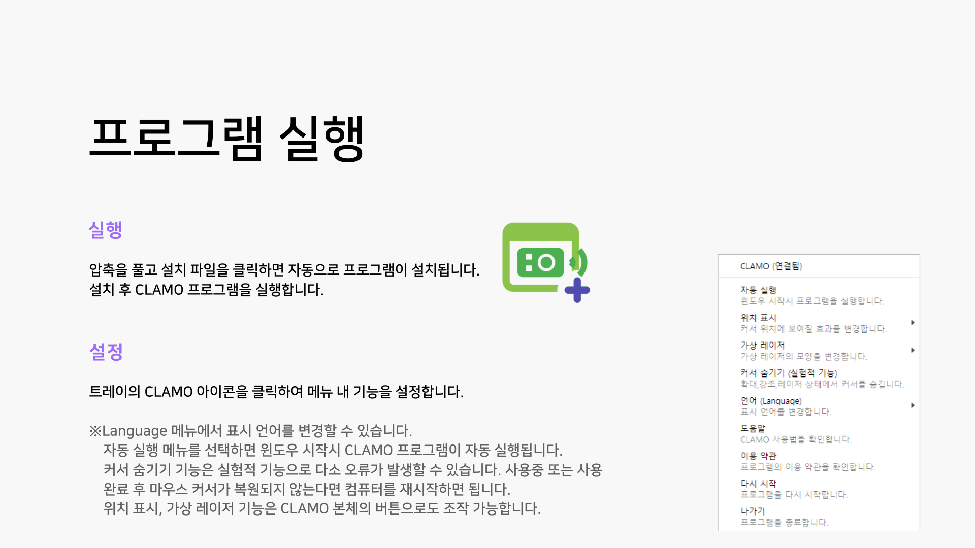 클래모는 프로그램 실행시 트레이 영역에 아이콘 형태로 보여집니다. 이 아이콘을 클릭하면 여러가지 설정 값을 변경할 수 있습니다. 설정 메뉴 중 위치 표시와 가상 레이저는 클래모 본체를 통해서도 변경할 수 있습니다.