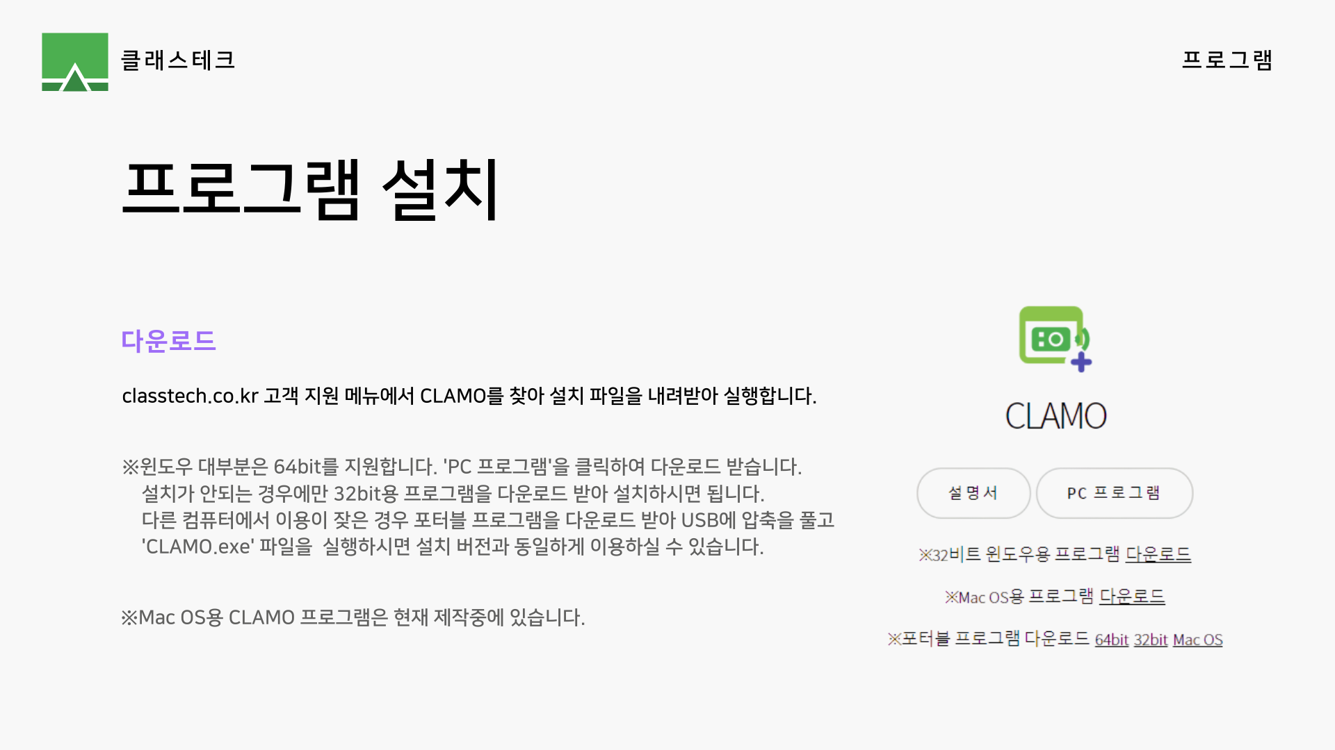 클래모의 모든 기능을 사용하기 위해서는 CLAMO 프로그램을 설치해야 합니다.