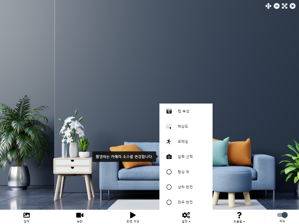 입력 선택에서는 여러 웹캠이 설치되어 있을 때, 출력을 원하는 웹캠을 선택할 수 있습니다.