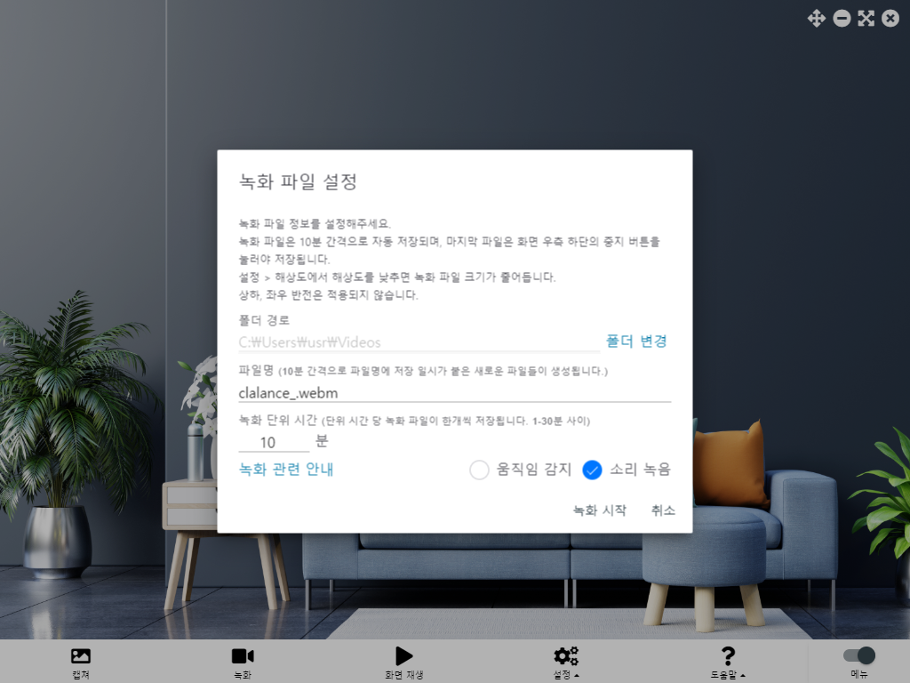 녹화는 웹캠의 실시간 화면을 녹화하는 기능으로 기본 10분 단위로 녹화가 진행됩니다.