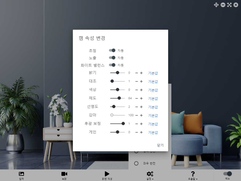 캠 속성에서는 웹캠의 하드웨어 세팅을 변경할 수 있습니다.