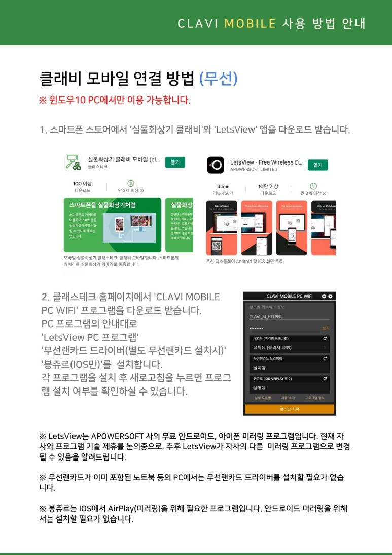 클래비 모바일 사용설명서 클래비 모바일의 설치 방법 및 프로그램 이용 방법을 제공합니다. 구성 소개 연결 종류 무선 연결 안드로이드, 아이폰에서 모두 이용 가능합니다. PC에는 윈도우10이