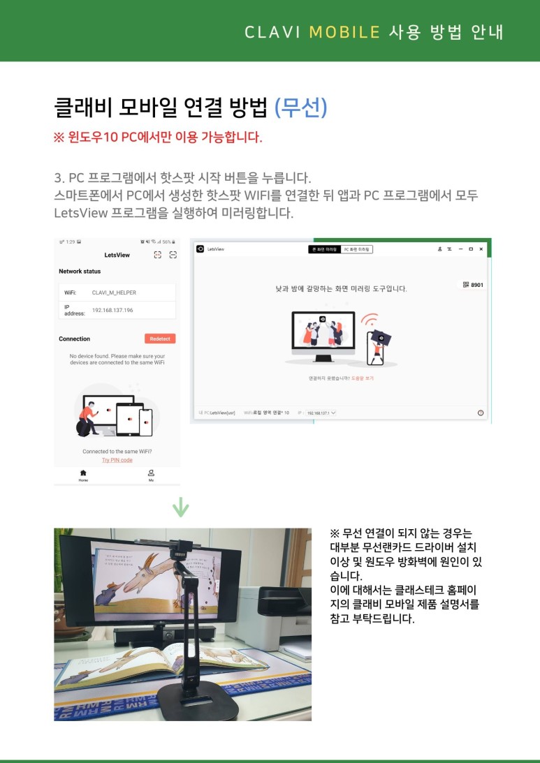 스마트폰을 실물화상기와 같이 활용할 수 있는 앱과 PC 프로그램이 패키징되어 있는 클래비 모바일입니다.