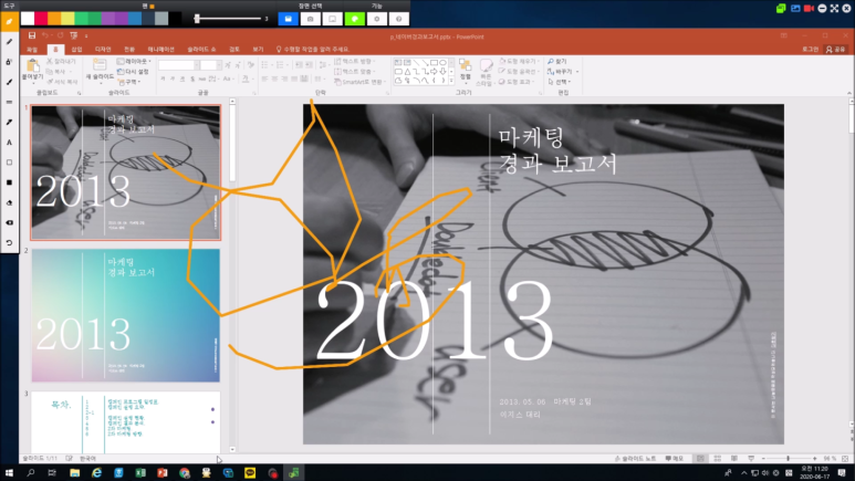 첫번째 장면은 윈도우 장면입니다. 투명한 윈도우 위에 저작할 수 있도록 되어 있습니다. 따라서 윈도우 장면 뒤에 파워포인트 문서, 한글 문서, 웹 브라우져 등을 놓고 그 위에 저작하여 사용하시면 됩니다.
